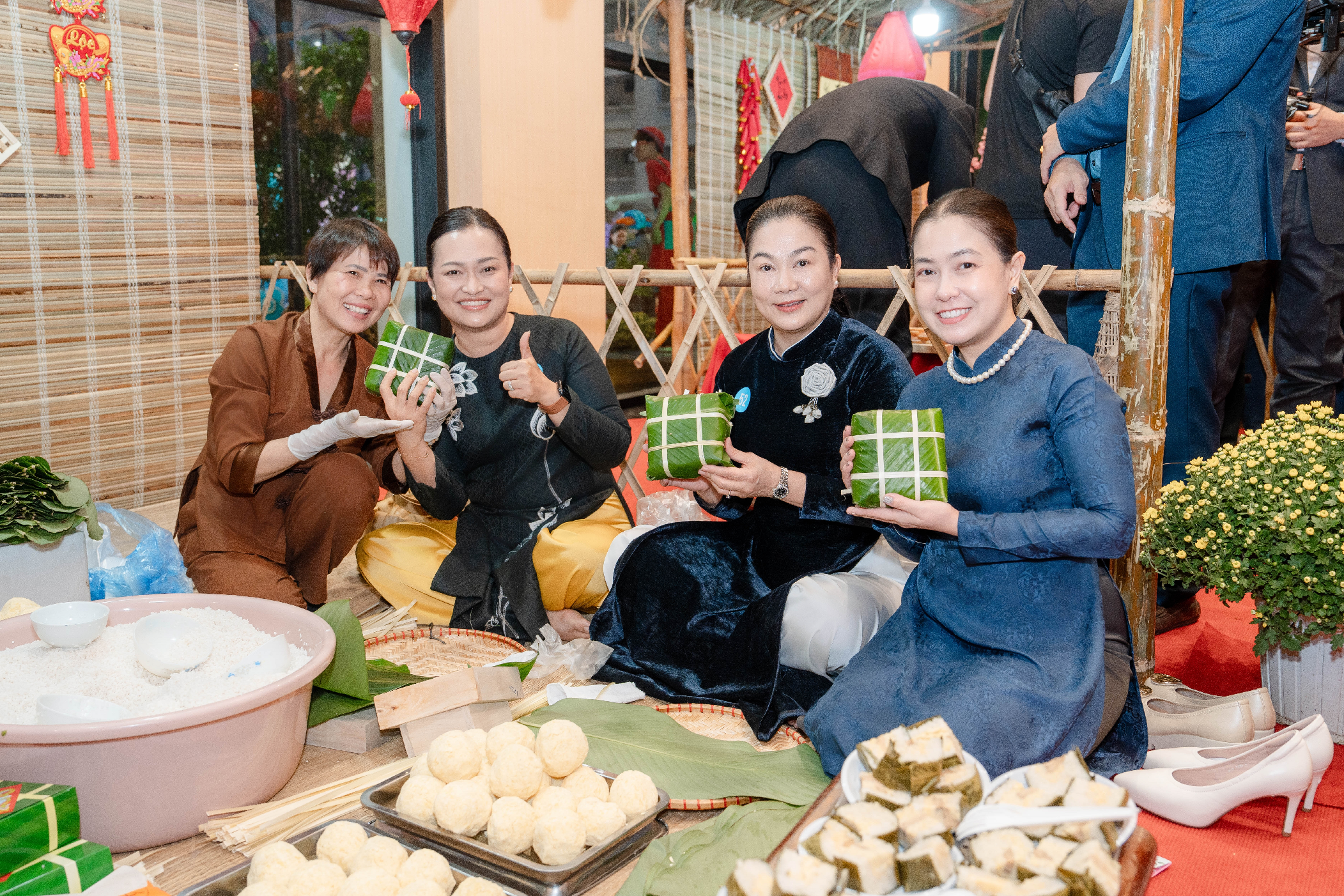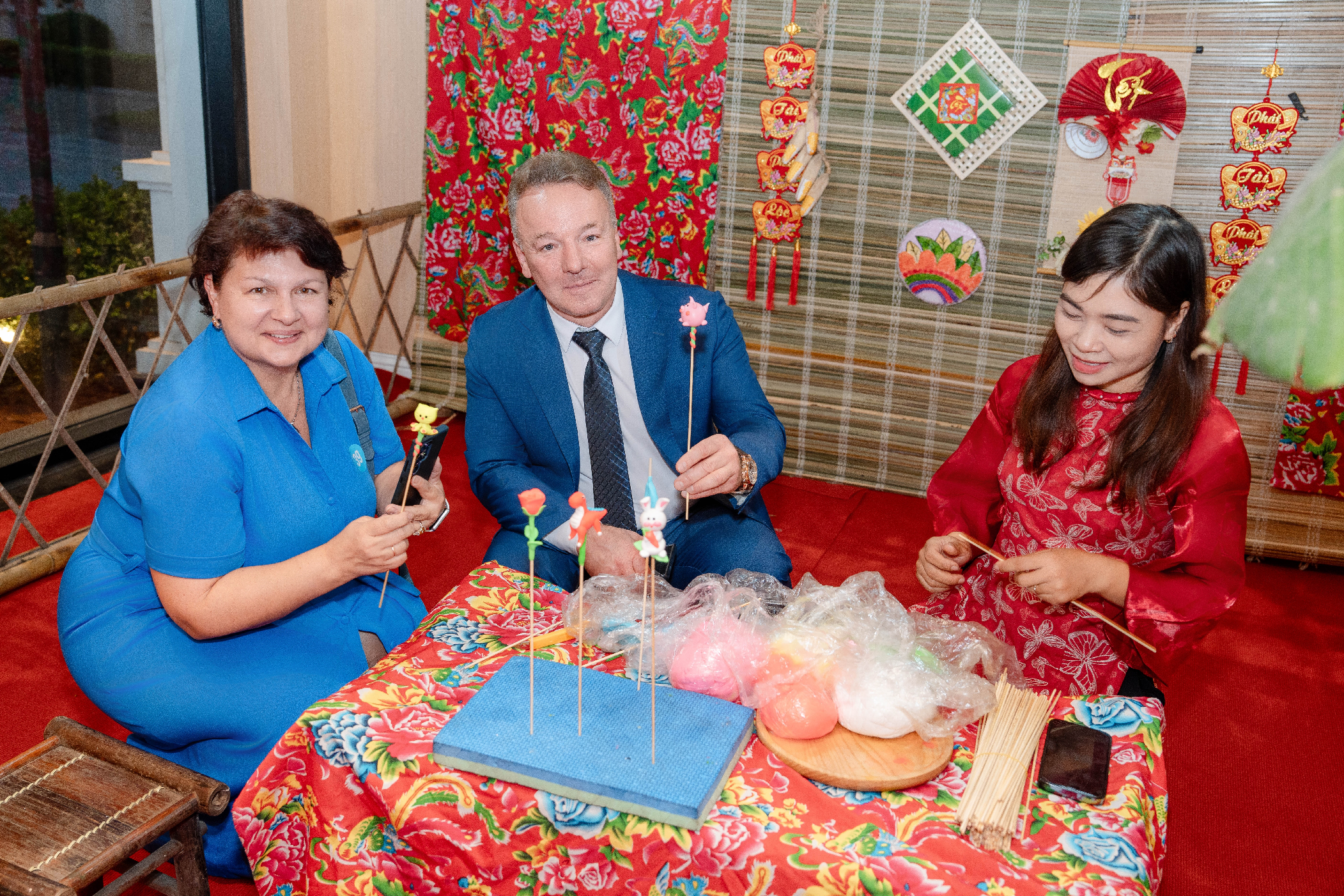 Không chỉ thưởng thức nghệ thuật, các tùy viên và khách mời còn được trực tiếp tham gia vào nhiều hoạt động trải nghiệm văn hóa Tết Việt được bố trí bên lề chương trình với các gian hàng chợ tết: làm bánh chưng, nặn tò he, viết thư pháp, …